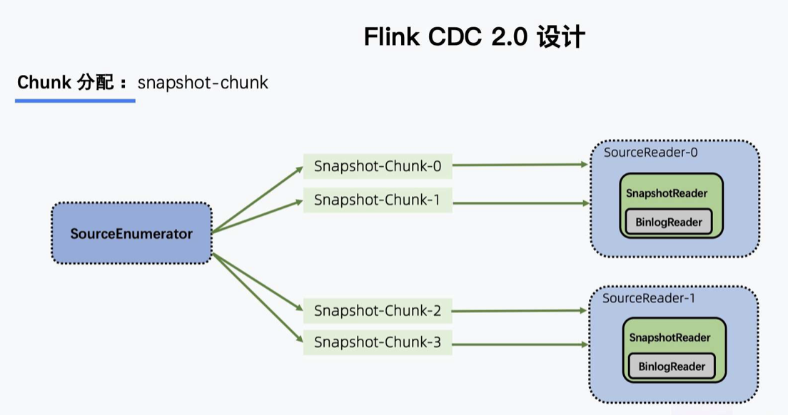 汇报的主要目的是为了后续分发 binlog chunk (如下图)。因为 Flink CDC 支持全量 + 增量同步,所以当所有 Snapshot Chunk 读取完成之后,还需要消费增量的 binlog,这是通过下发一个 binlog chunk 给任意一个 Source Reader 进行单并发读取实现的。