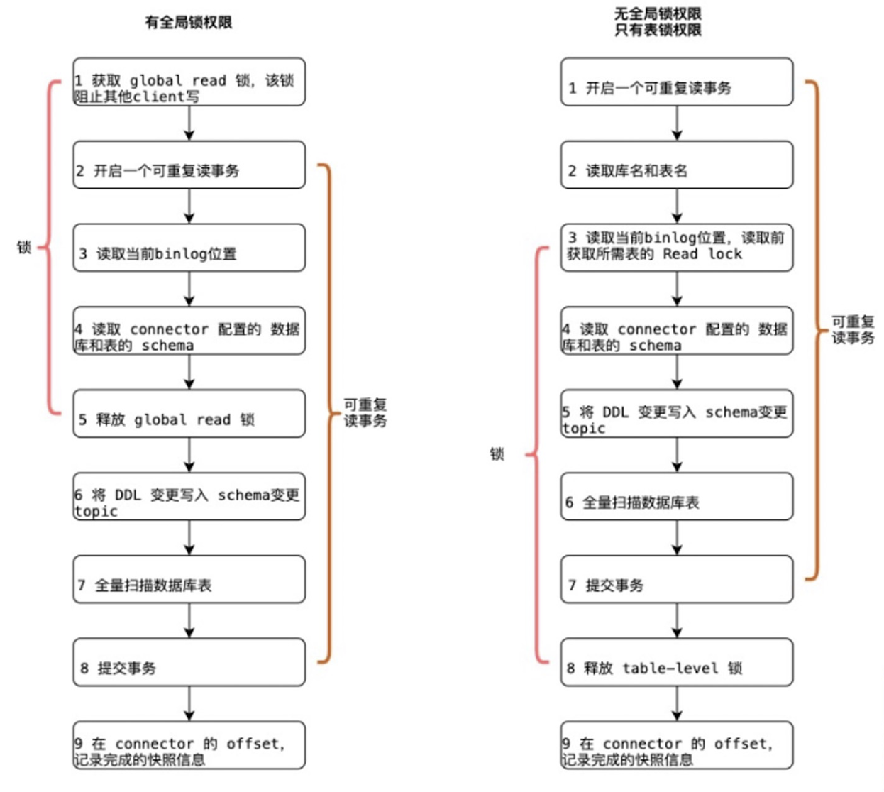 大部分用户使用的场景都是全量 + 增量同步,加锁是发生在全量阶段,目的是为了确定全量阶段的初始位点,保证增量 + 全量实现一条不多,一条不少,从而保证数据一致性。从下图中我们可以分析全局锁和表锁的一些加锁流程,左边红色线条是锁的生命周期,右边是 MySQL 开启可重复读事务的生命周期。