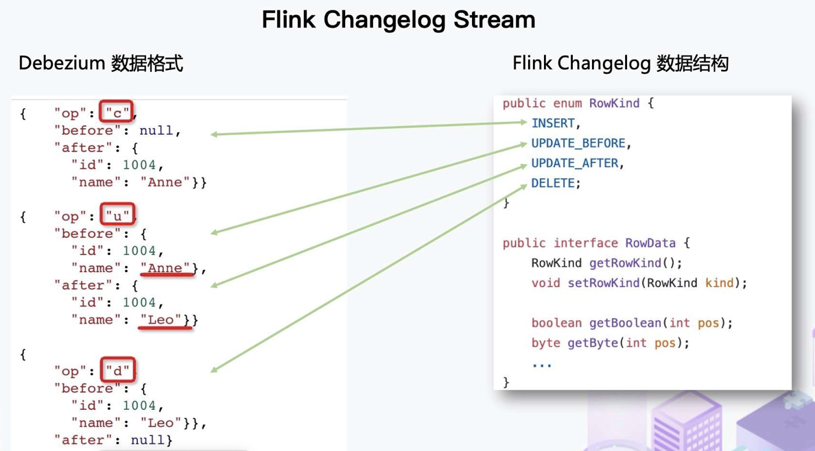 - 每条 RowData 都有一个元数据 RowKind,包括 4 种类型, 分别是插入 (INSERT)、更新前镜像 (UPDATE_BEFORE)、更新后镜像 (UPDATE_AFTER)、删除 (DELETE),这四种类型和数据库里面的 binlog 概念保持一致。