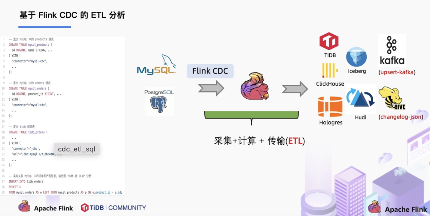 该例子是通过 Flink CDC 去同步数据库数据并写入到 TiDB,用户直接使用 Flink SQL 创建了产品和订单的 MySQL-CDC 表,然后对数据流进行 JOIN 加工,加工后直接写入到下游数据库。通过一个 Flink SQL 作业就完成了 CDC 的数据分析,加工和同步。