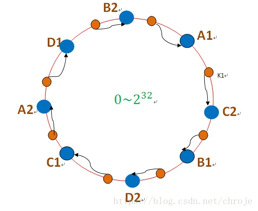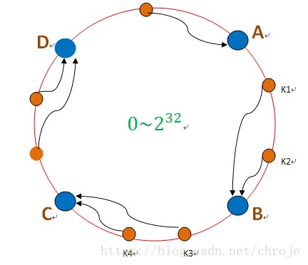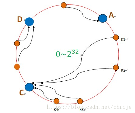 K1-K4为数据在环上的hash值,A-D为服务器在环上的hash值。