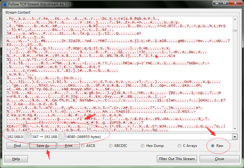 - 在你分析这个流的时候 直接打开看到的就是一段貌似乱码的东西。然后选择你要查看的发送和接收方,以原始数据(raw)来另存为.tar.gz 文件,操作如下图。