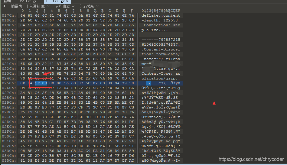 2.使用010editor 十六进制编辑器来打开这个.tar.gz的文件。这种压缩格式的文件开头是1F8B,找到这个删除之前的全部内容,该文件后有boundary分隔符,将这部分删去,即掐头去尾留下来的就是真正的数据。