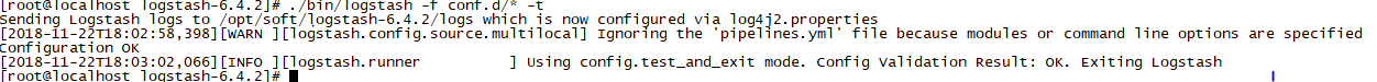 7、启动logstash,启动之前执行命令./bin/logstash -f conf.d/* -t,检测配置文件是否ok,如下: