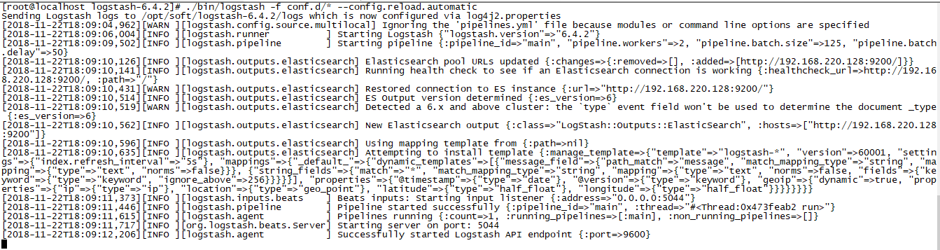 8、执行命令./bin/logstash -f conf.d/* --config.reload.automatic,启动logstash:。