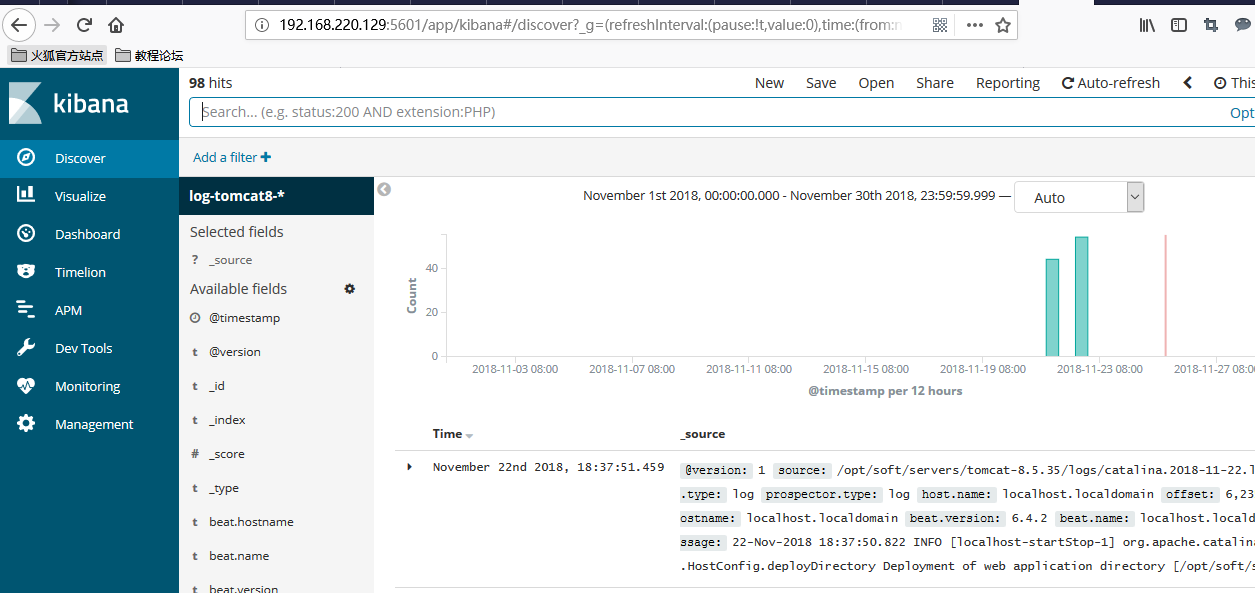 ELK全部搭建完成,但是需要将ELK串起来方可起作用,按照上述步骤,串起来之后,访问kibana如下: