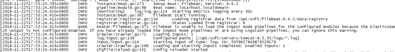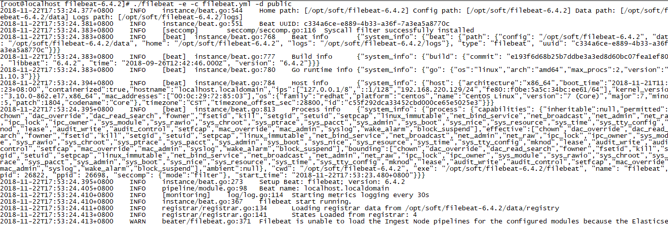 ④、启动filebeat,执行命令:./filebeat -e -c filebeat.yml -d public