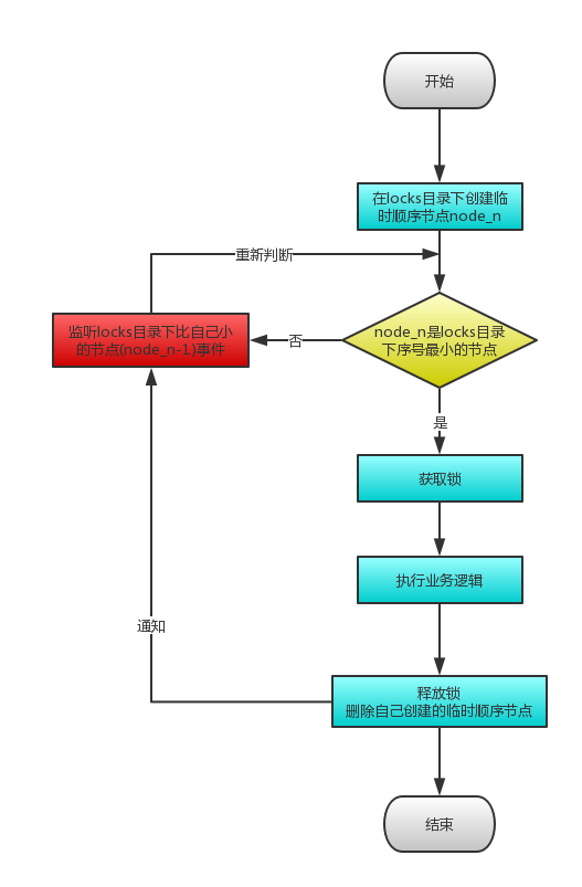 注意:判断自己是否是locks目录下序号最小的节点,只会和比自己序号小的那个相邻节点进行比较,这样大大提高了效率。比如N节点只会和N-1几点比较,不会和N+1,N-2节点比较。