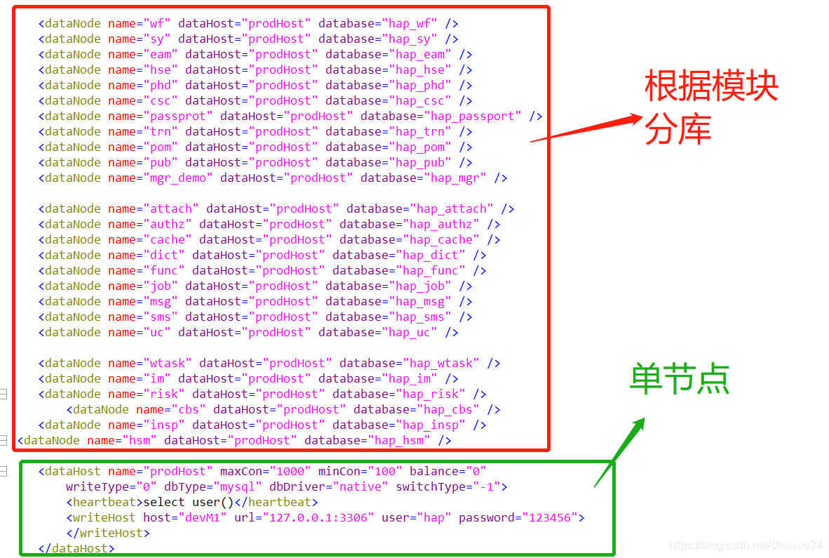 目前平台是基于mycati1.5做的一个垂直分库方案(各个模块有自己的库),mycat的配置如下图所示: