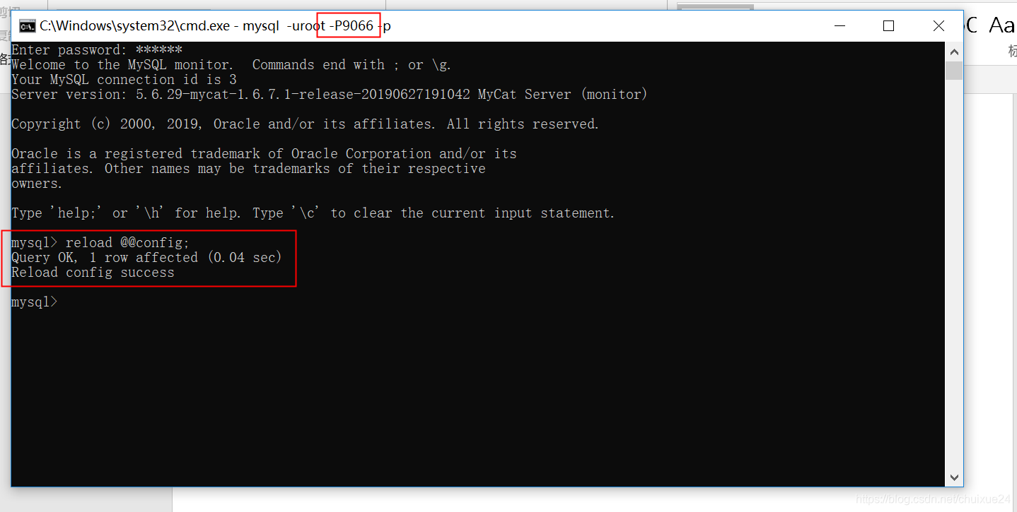 - 最后需要连上mysql管理端口(默认为9066)执行reload @@config;,让mycat加载最新配置,此过程不需要重启mycat,也不需要重启数据库。