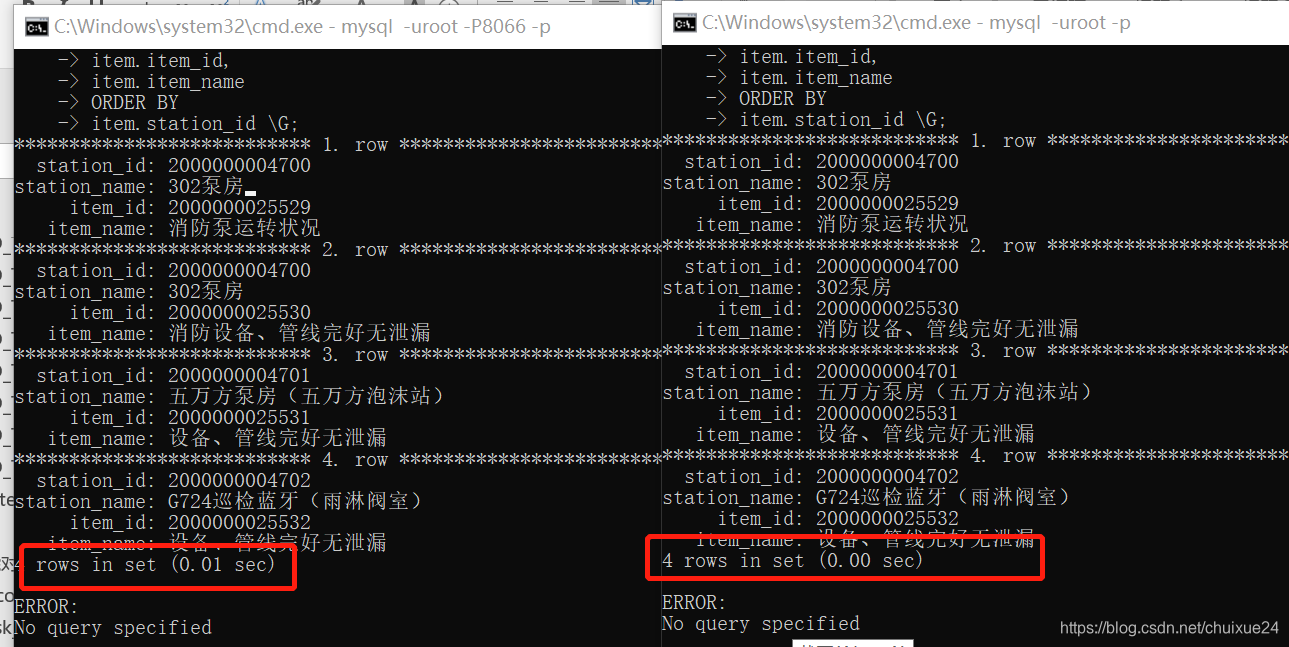 (两个查询执行的情况均在未为加索引csc_task_item (item_id,check_time);下执行)