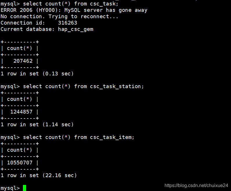 如下图所示,执行sql为select count(*) from csc_task_item;分表前执行时间2.18秒,分表后1.54秒