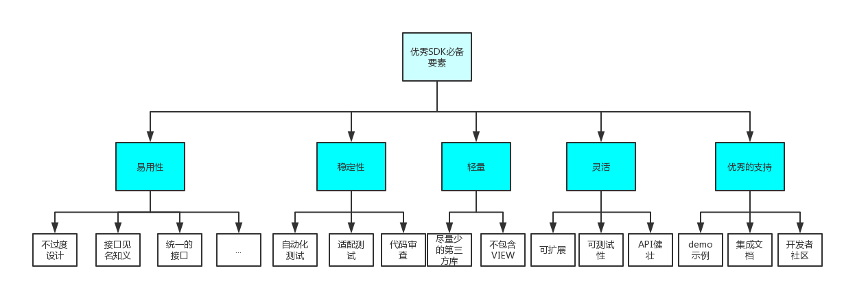 API的稳定: 一个好的SDK设计的API应该从一开始就需要考虑扩展性,尽量多的考虑将来可能的需求,尽量将这些需求包进来.我见过很多开发者懊恼如果让我再设计一次一定能够将这个接口设计的更好一些 :)