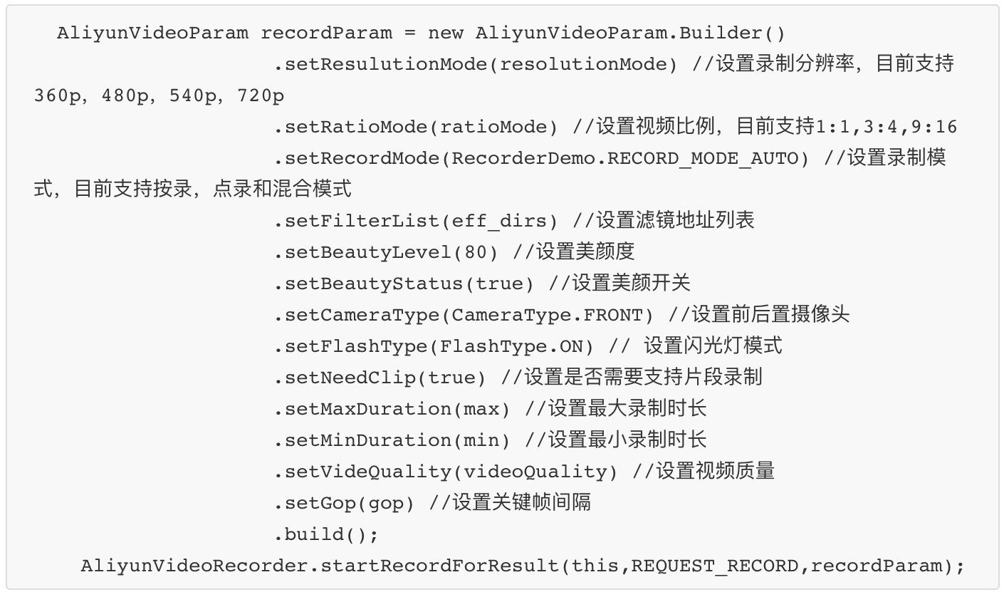 •尽量多的默认参数,这里面有一些小的技巧,以下我提一个小的例子,比如我们的SDK,我们有一个跳转录制的接口,事实上就是将一堆的参数给到下一个SDK页面,让SDK接收参数,我们选择给一个结构体暴露给用户,如下: