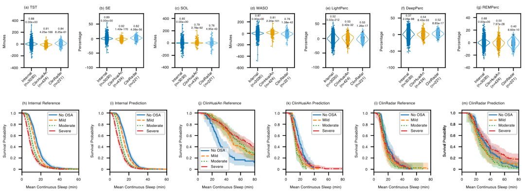 图4:睡眠参数估计的性能评估a–g 展示内部数据集(n=3030 个夜晚)、ClinHuaiAn 数据集(n=424 个夜晚)和 ClinRadar 数据集(n=221 个夜晚)中,各项睡眠参数(总睡眠时间TST、睡眠效率 SE、入睡潜伏期 SOL、夜间清醒时间 WASO,以及浅睡眠、深睡眠和快速眼动睡眠 REM 的占比)实际值与预测值的对比。