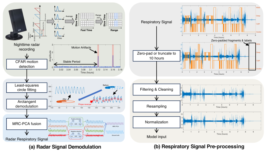 图2:用于睡眠分析的雷达信号解调与呼吸信号预处理流程。该图展示了模型输入前完整的信号处理流水线。a 雷达信号解调:原始雷达记录通过恒虚警率(CFAR)进行运动检测,识别稳定呼吸片段。采用最小二乘圆拟合和反正切变换对这些片段进行解调,随后通过最大比合并-主成分分析(MRC-PCA)融合实现信号级增强,最终得到纯净的呼吸波形。b 呼吸信号预处理:雷达衍生信号与呼吸带衍生信号采用统一处理流水线,包括固定时长截断、伪影去除、低通滤波、均匀重采样(约34.13赫兹)及Z分数标准化。关键处理阶段的样本输出展示了信号优化效果,且与带标注的睡眠分期保持一致,为后续分析提供支持。