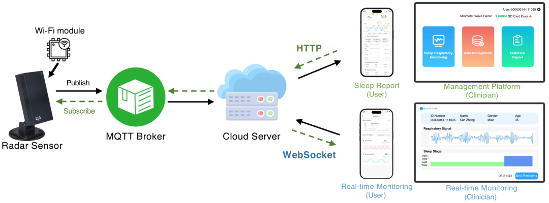图5:远程睡眠管理平台架构。平台的端到端架构,涵盖数据采集、处理与分发全流程。核心组件包括用于非接触式数据采集的雷达传感器、实现高效数据传输的消息队列遥测传输(MQTT)代理、负责计算与存储的云服务器,以及供临床医生和患者使用的用户界面——二者可分别获取实时及历史睡眠健康观察。
