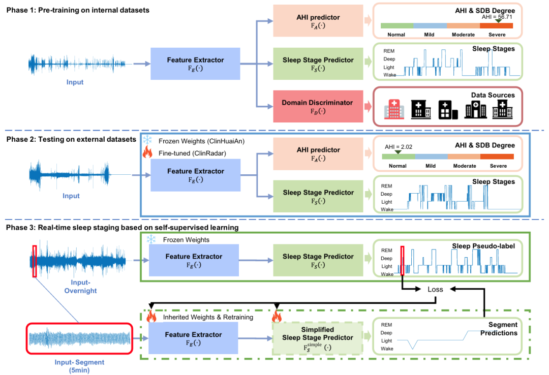 图3:睡眠分期与睡眠呼吸障碍预测的多阶段流程图。第一阶段,利用呼吸带记录的胸腹运动信号,在内部数据集上对模型进行预训练。特征提取器 FE (⋅) 首先对输入的睡眠信号进行处理,提取相关特征。这些特征随后输入至两个预测器:用于评估睡眠呼吸暂停严重程度的呼吸暂停低通气指数(AHI)预测器 FA (⋅),以及用于预测不同睡眠阶段的睡眠分期预测器 FS (⋅)。同时引入领域判别器 FD (⋅) 以区分数据源,提升模型的泛化能力。第二阶段,将预训练网络(含特征提取器、AHI 预测器及睡眠分期预测器)以权重冻结的方式应用于呼吸带衍生的呼吸信号(ClinHuaiAn 数据集),并针对雷达衍生的呼吸信号(ClinRadar 数据集)进行微调。第三阶段,将模型用于实时睡眠分期。输入信号分为整夜信号和 5 分钟片段信号:整夜信号经权重冻结的特征提取器和睡眠分期预测器处理,生成伪标签;该伪标签与片段信号共同用于特征提取器的进一步微调。随后采用简化版睡眠分期预测器,实现实时睡眠分期预测。