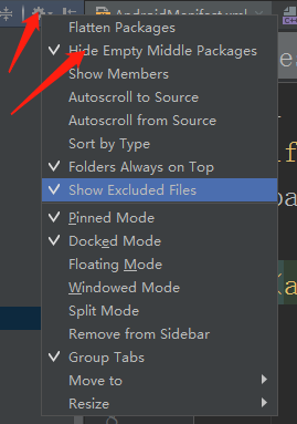 ① 在AS(Android Studio简称)中,我们经常在一个项目中,创建包名,这都是大家经常遇到的,但是大家对修改包名,是否也这样喜闻乐见,做到很熟悉,今天就教大家更改包名,一般大家的做法都是选中包名之后右键选择Refactor->Rename,进行更改包名,但是这只是更改当前包的包名,如何更改上一级或者上几级的包名呢?如下图所示,在项目中左侧右上角有一个类似于设置的图标,按照图片取消箭头勾选的选项,你就会发现目录结构发生了改变,你可以改变任意位置的包名。