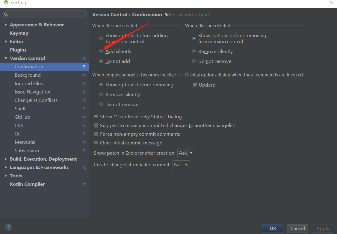 ③ 在我们使用Git的时候,如何在AS上将你新创建的文件自动关联到Git上,不用每次在创建完成的时候,进行选择是否关联Git的操作,当然大家说,我在弹出选择的时候选择默认以后总是进行Git关联,这里要说的是,我们如果这样做了,一旦你出现你不想关联怎么办?怎么样能手动更改呢?如下图所示就是设置自动进行Git关联,箭头所指的位置就是设置自动Git关联位置,箭头下方图中选中的原点就是取消自动关联的设置。