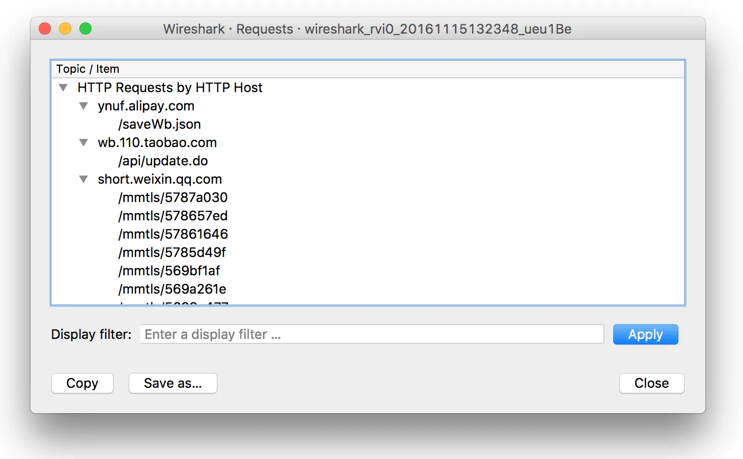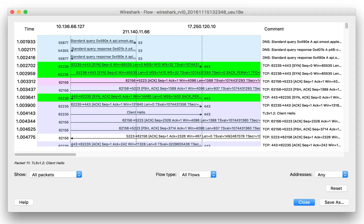 和Follow Stream不同的是我们获取到的是完整的流量,从上图中可以看出从10.136.66.127(我的iPhone手机IP地址)发出的流向多个服务器的网络流量,包括DNS解析和SSL安全握手等。当然我们也可以在上图中下方的操作区域做进一步的过滤,可以使用Display Filter做进一步的流量定位。