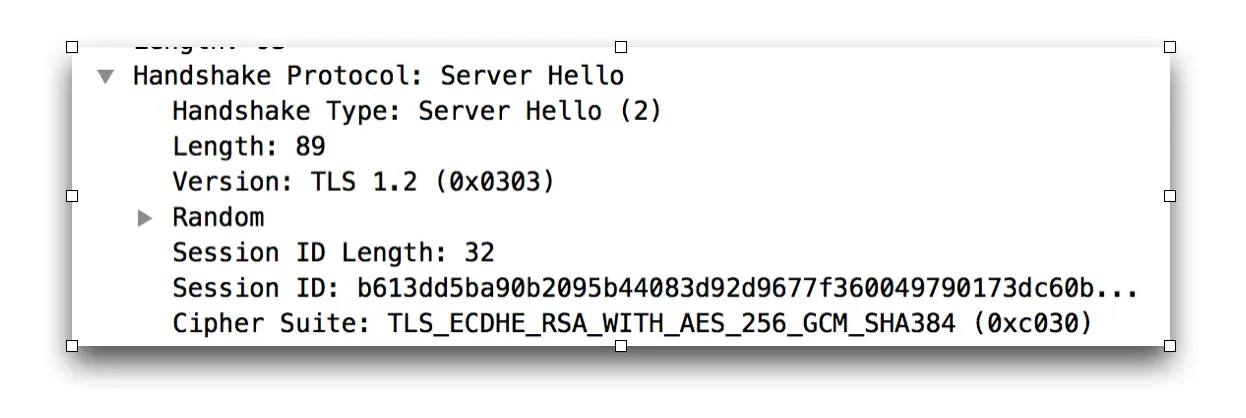 Server Hello这个包带上服务器这一端的一些信息,比如Server所选择的tls版本,或者带上可以重用的Session ID避免重新握手,在Client传过来的Cipher Suites当中挑选一个Cipher Suite进行后续的安全通话等。