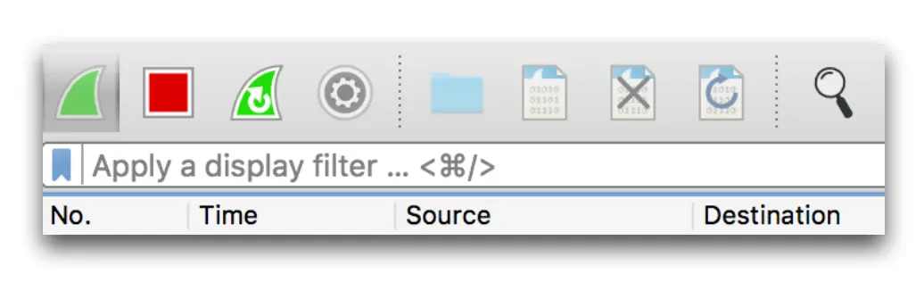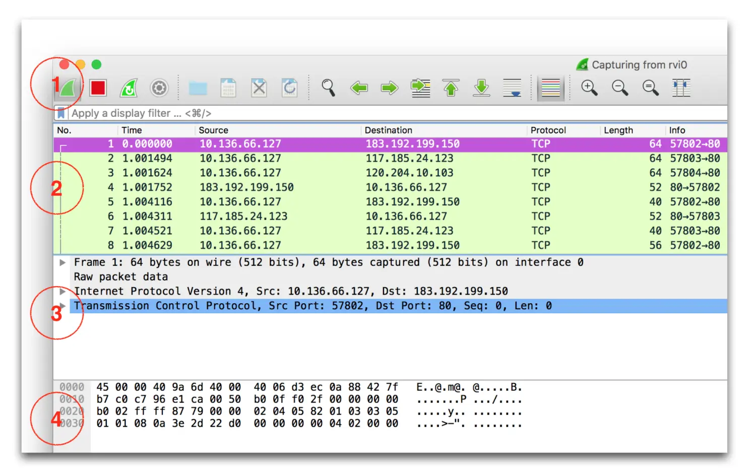 Wireshark的流量监控界面主要分为四块,由上至下第一部分(标号为1)是工具栏,通过工具栏我们可以控制监控的行为,比如开始抓包,停止抓包,重新开始抓包,以及在包之间跳转等等。工具栏的底部有个输入框,可以让我们手动输入包的过滤条件,这部分对于熟练使用Wireshark抓包非常重要,后面会详细的讲解。