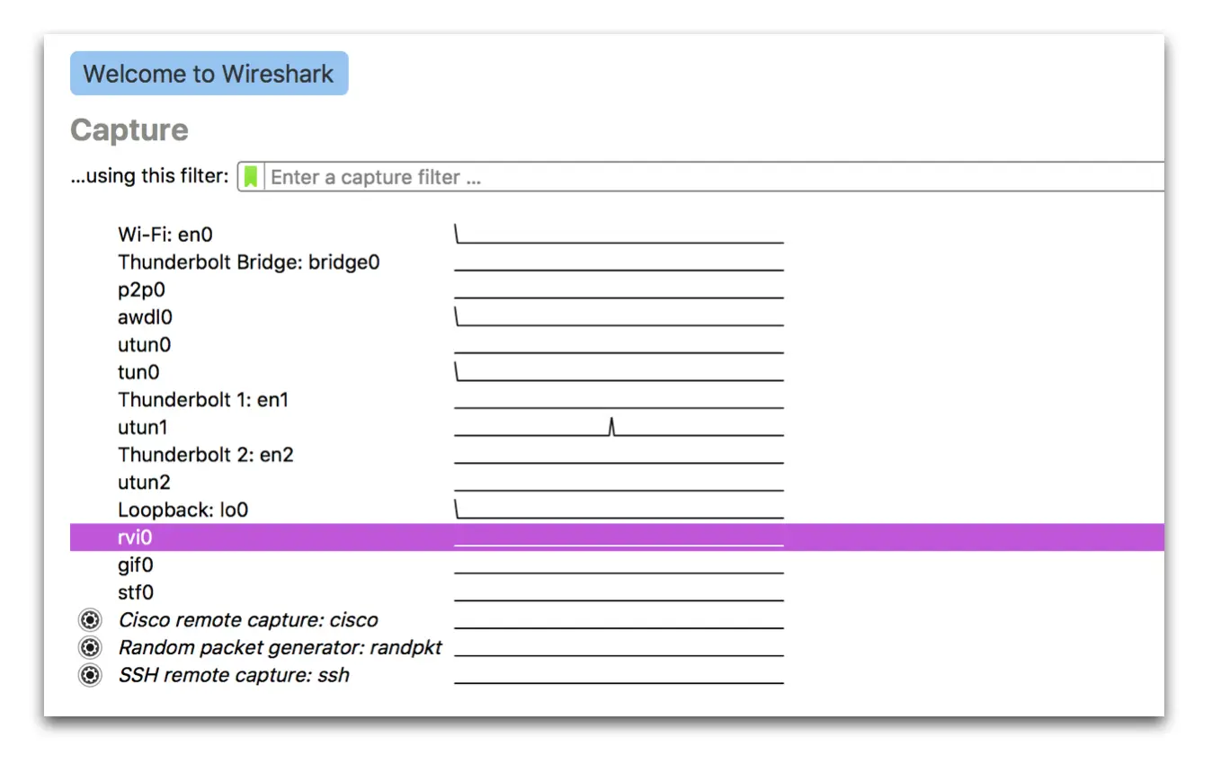 Capture Filter的规则和我们平常使用tcpdump的filter语法是一致的,比如为了只监控http的流量,我们可以先在初始化界面选中rvi0网卡,再在capture filter输入框里输入: