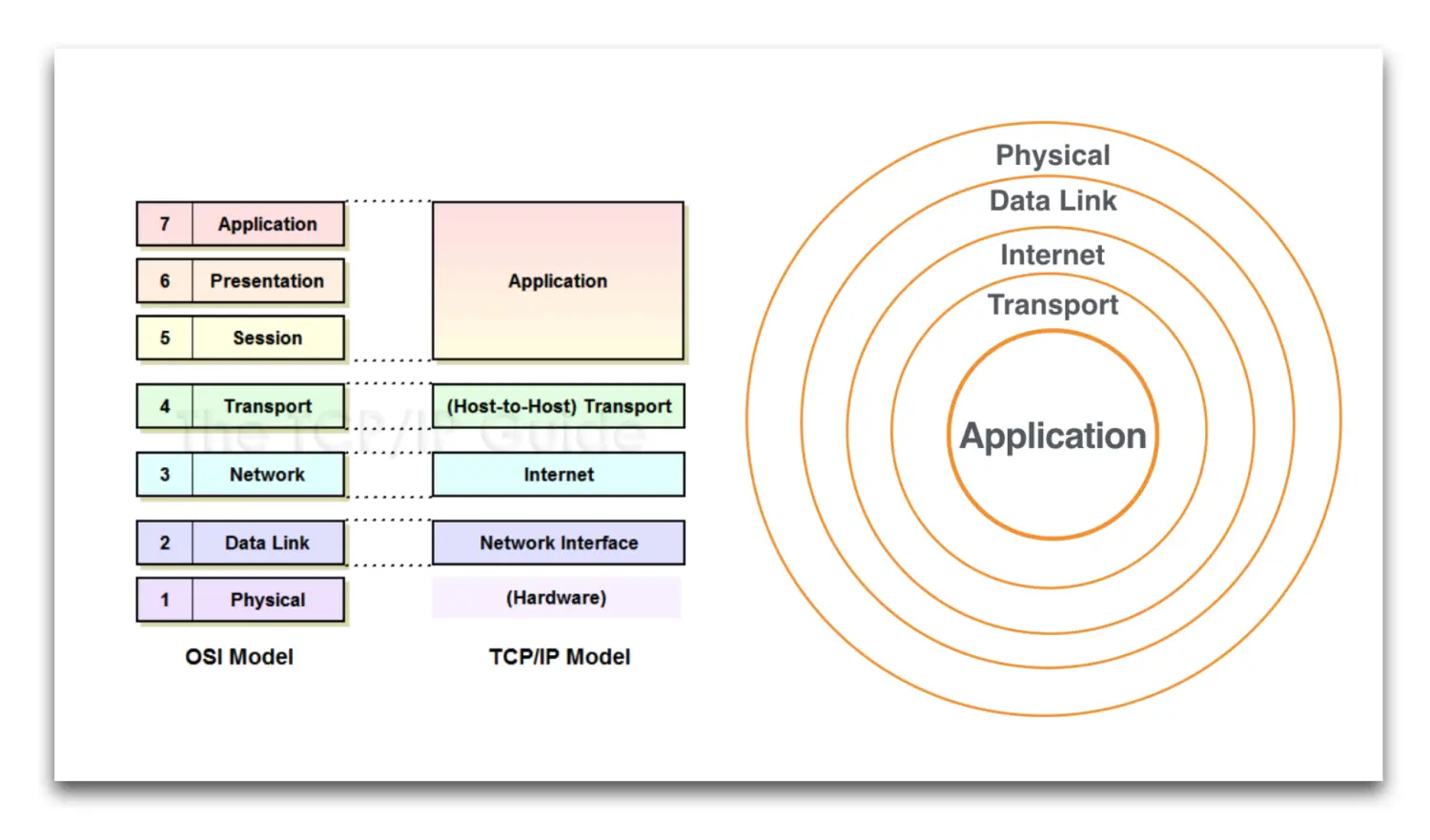 我们最初学习网络协议的时候,无论是OSI七层模型,还是经典的TCP/IP五层结构,都是以下图中的左边部分的形式展示的。