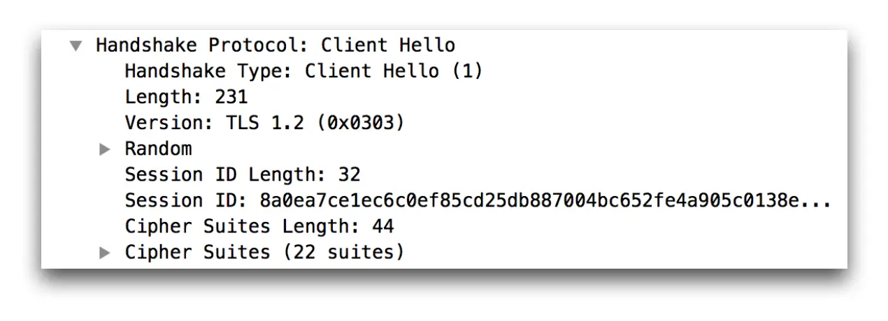 这一个包是ssl握手的起始包,客户端(我的iPhone)会携带当前会话所依赖的一些关键信息:使用的tls版本(当前为tls1.2),上次的Session ID(如果可以session重用,就可以避免当前这次的安全握手),客户端所支持的加密算法套件(从下图中可以看出可以从22个suites里面挑选)等。