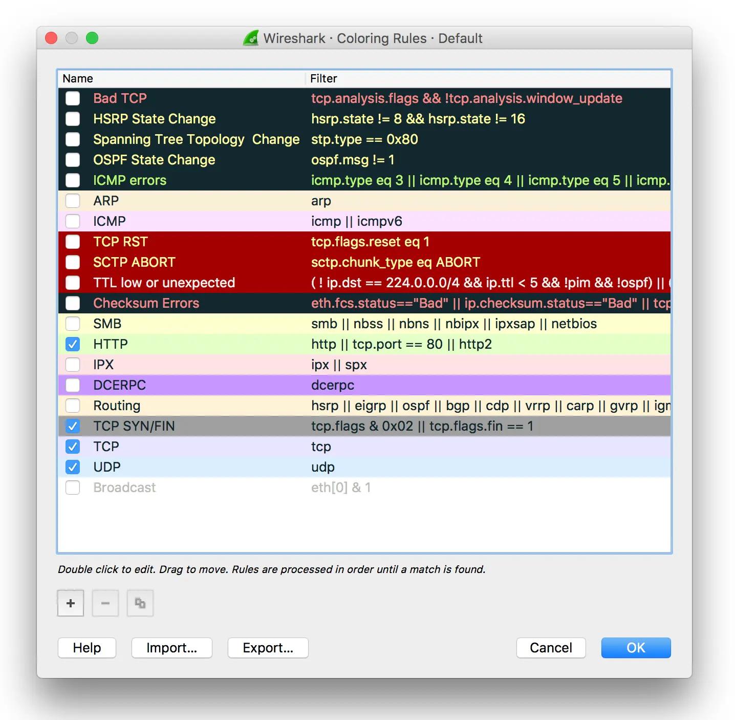 具体的规则可以通过菜单View->Coloring Rules...查看,默认规则如下: