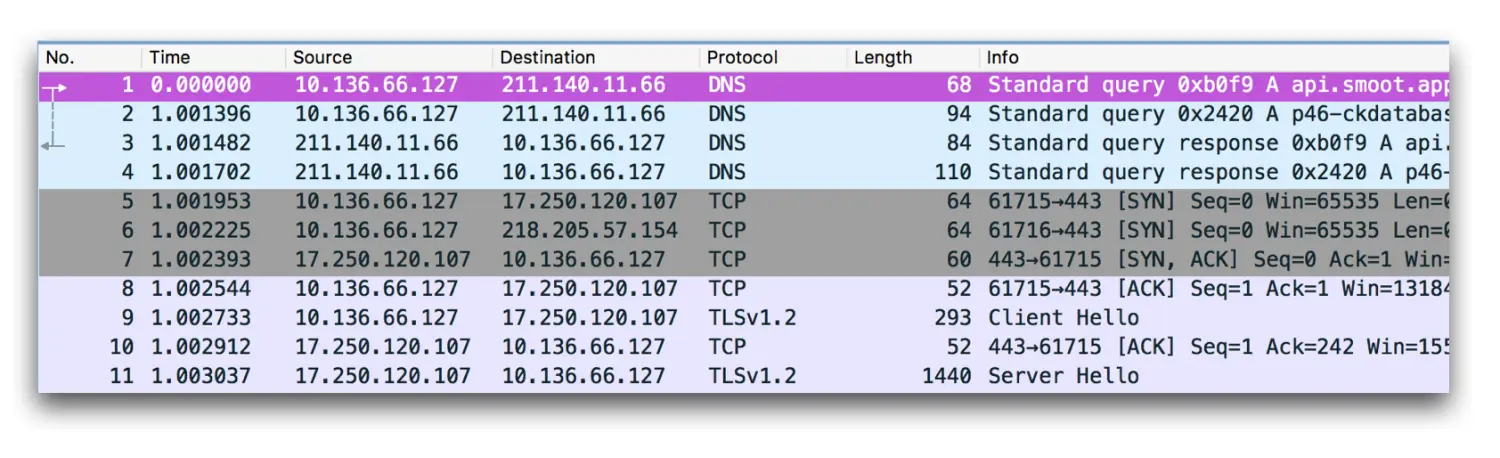 介绍完使用方式再来实际分析下HTTPS的流量。下图是我使用Wireshark在iPhone上抓包知乎App网络请求的结果: