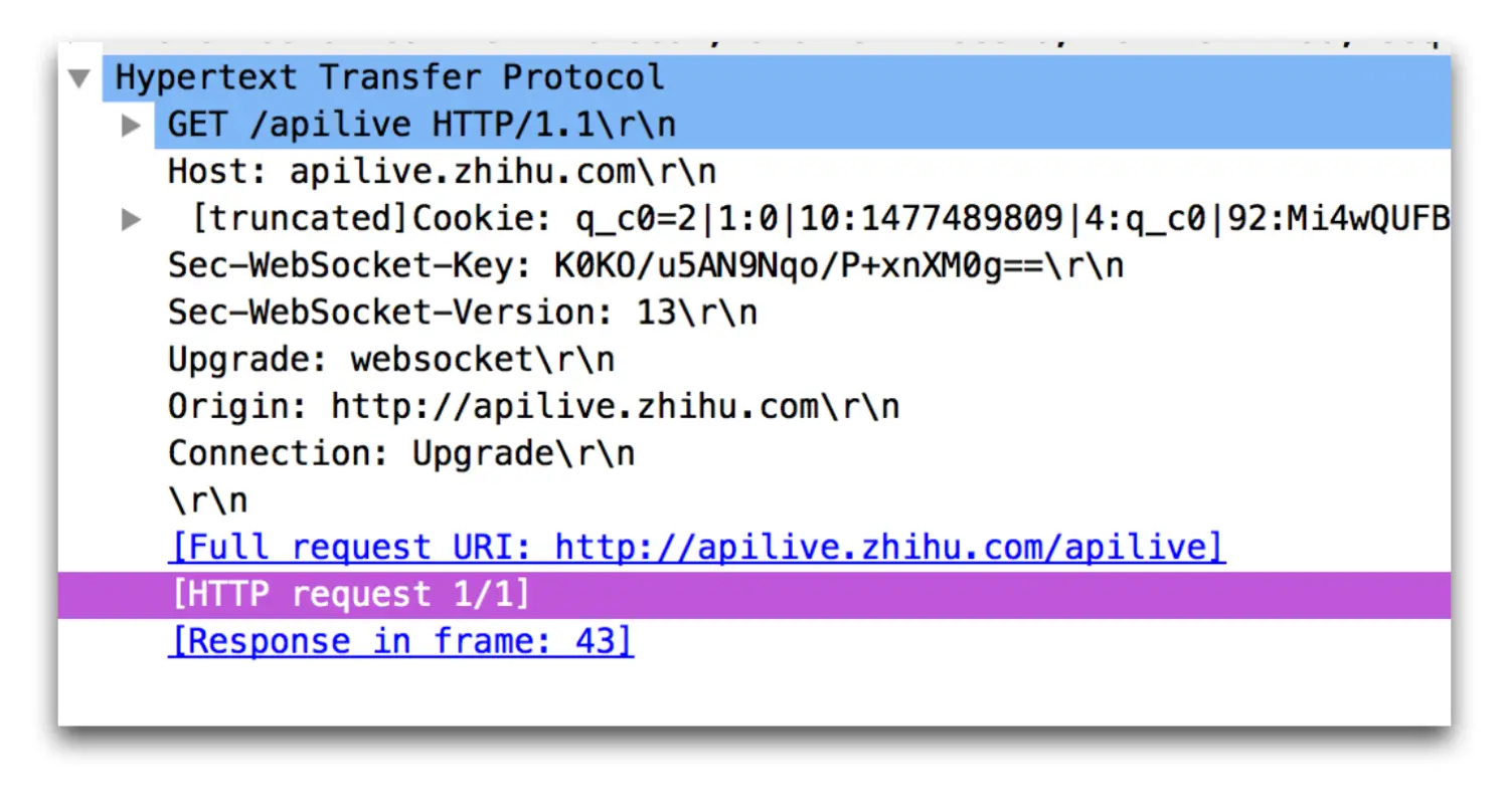 Packet详情面板以符合http协议的表述,将header中各个field清晰的罗列出来了,阅读起来很方便。
