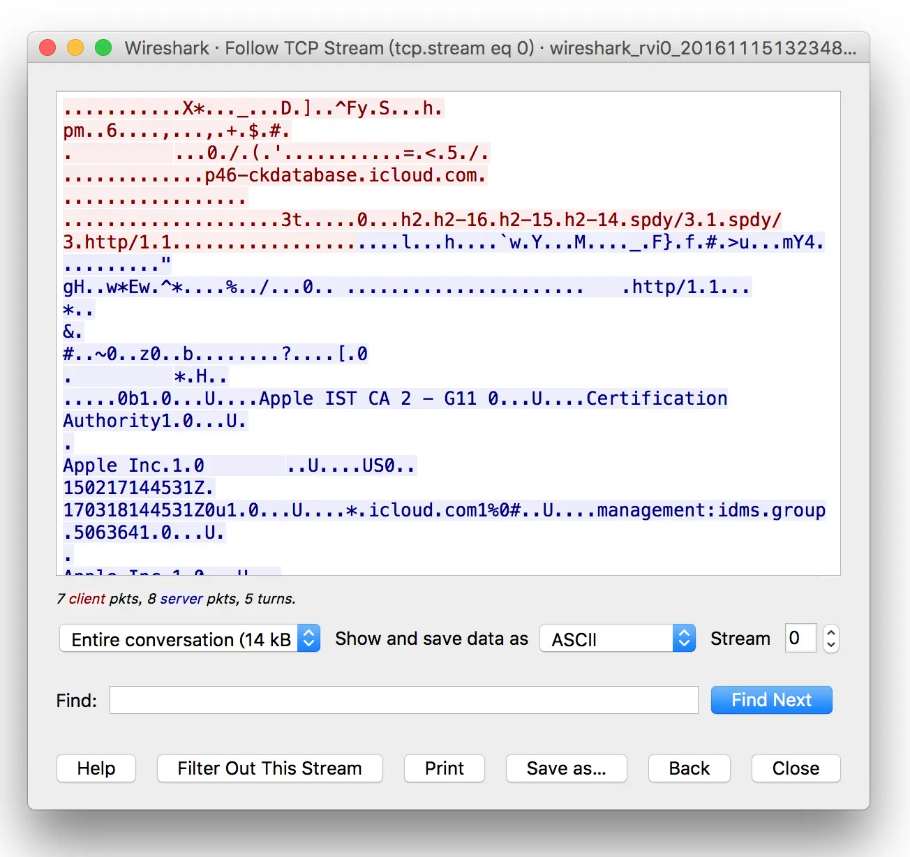 Wireshark支持我们常见的四种Stream,TCP,UDP,HTTP,SSL。比如我们选中Follow TCP Stream之后可以得到如下的详细分析输出(样本为监控iPhone手机的流量):