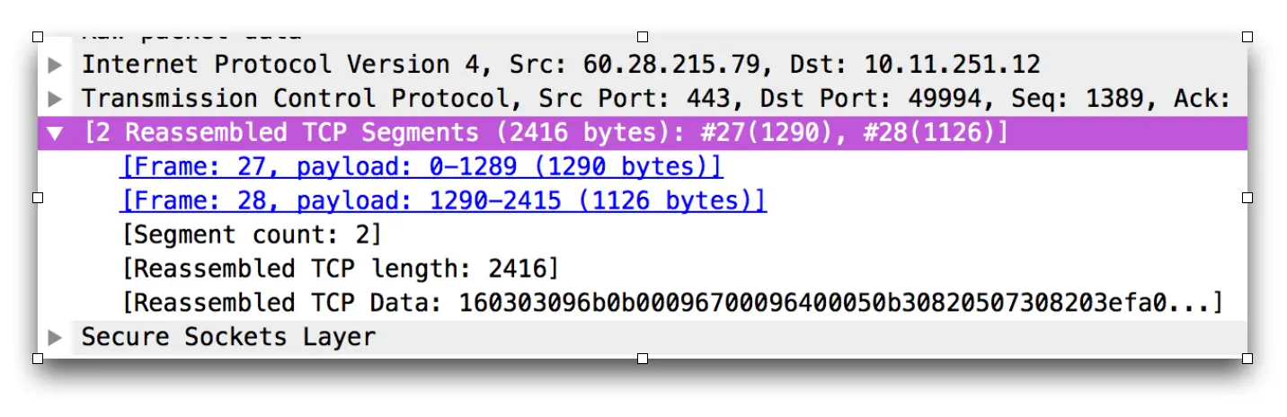 从包列表界面可以看出,Certificate(大小为2407个bytes)这个包由于超过了1440个字节,被拆成了2个包,所以我们可以在包Info里面看到[TCP segment of a reassembled PDU],我们使用Wireshark抓包的时候经常会看到reassembled PDU,出现这种情况是因为包太大,超过了MSS,需要拆成两个来发送。