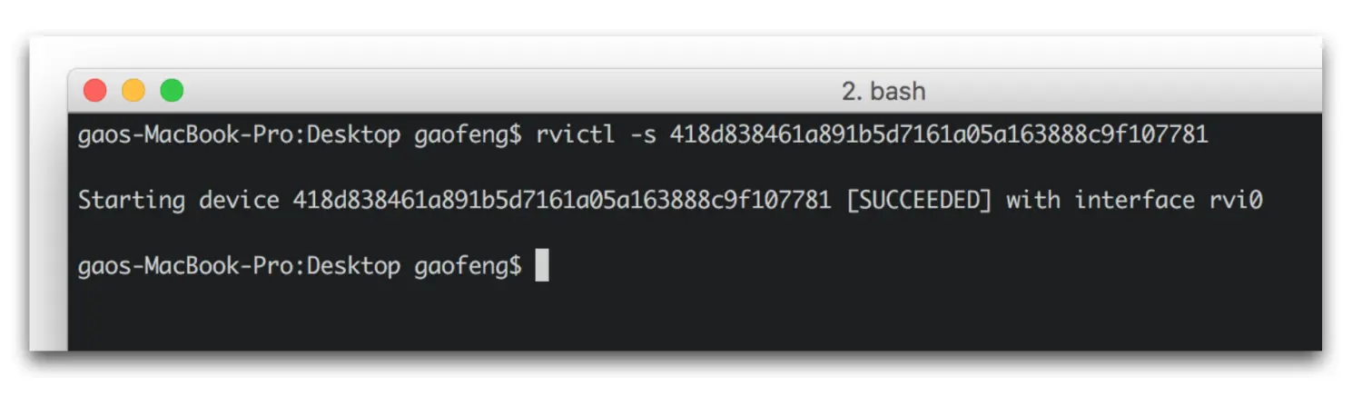 当我们把iPhone通过usb连接macbook时,Wireshark并不能直接监听通过iPhone的网络流量,需要通过一个系统程序在我们的Mac系统上,建立一个映射到iPhone的虚拟网卡,在terminal中输入如下命令即可: