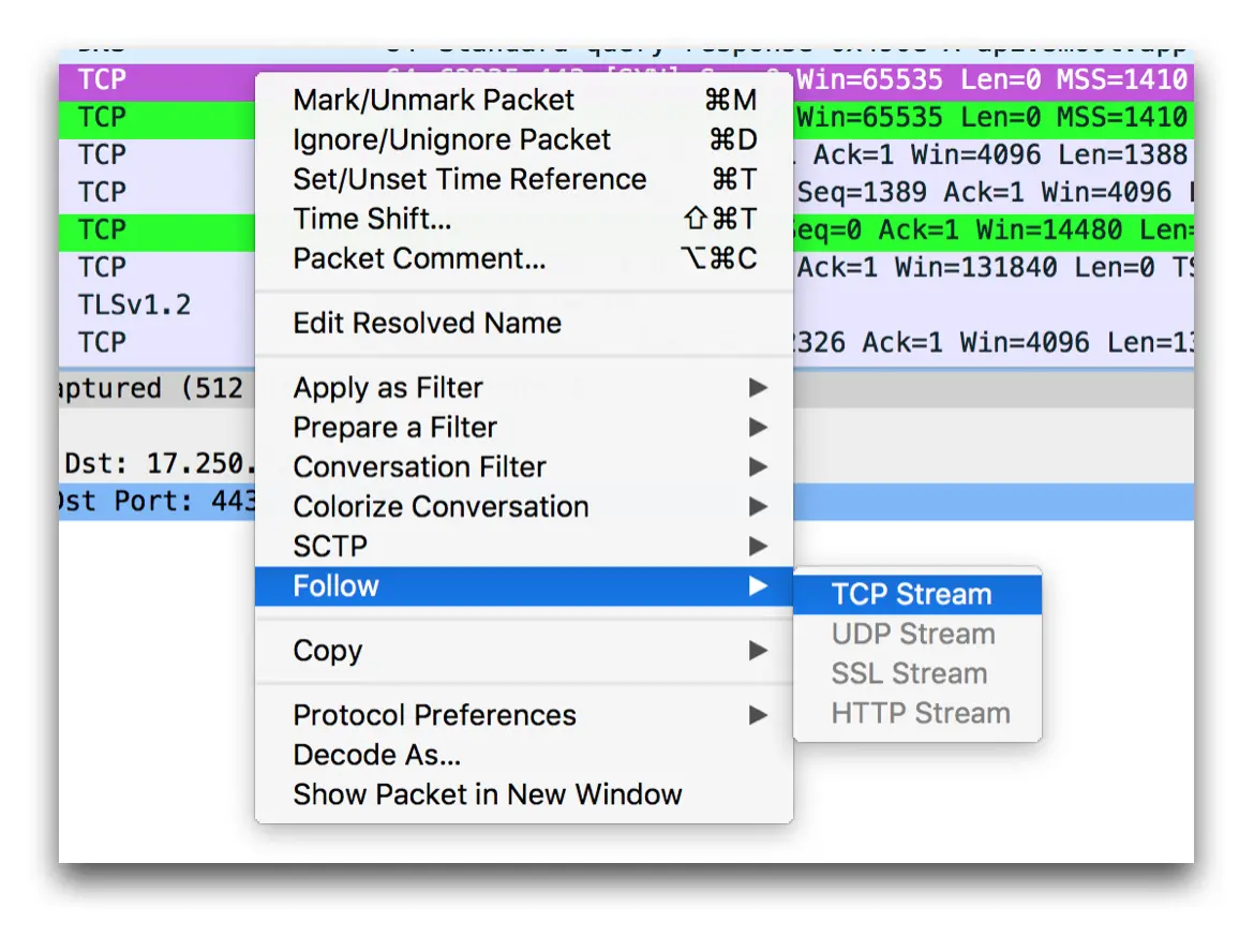 Wireshark默认情况下将不同网络连接的流量都混在一起展示,即使给不同协议的包上色之后,要单独查看某个特定连接的流量依然不怎么方便,我们可以通过Wireshark提供的两种方式来实现这个目标。