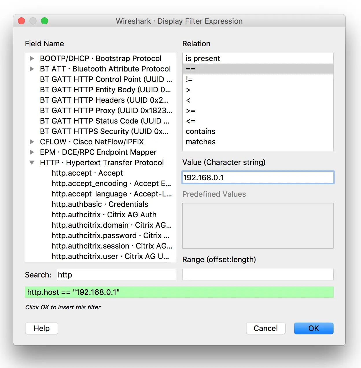 Display Filter的语法本质上是个等是关系描述,我们可以在search当中输入我们感兴趣的协议比如http,再在展开的协议头里选择我们的条件比如http.host,最后设置Relation和Value就可以生成一个Display Filter条件了。