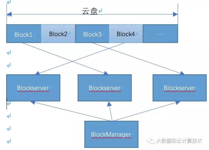云盘逻辑卷按block切分,为了便于recover,按1G切分,第一层路由由blockManager管理,按volumeid+offset 映射到逻辑block,逻辑block location在三台blockserver上。Blockserver预先创建一个1G文件(falloc,防止写过程中空间不够),称为物理block。对于逻辑卷这段区间所有的IO操作都会落到这个物理block文件上,很容易实现pwrite。当然也可以基于裸盘,在os看来是一个大文件,分割成不同的1G文件