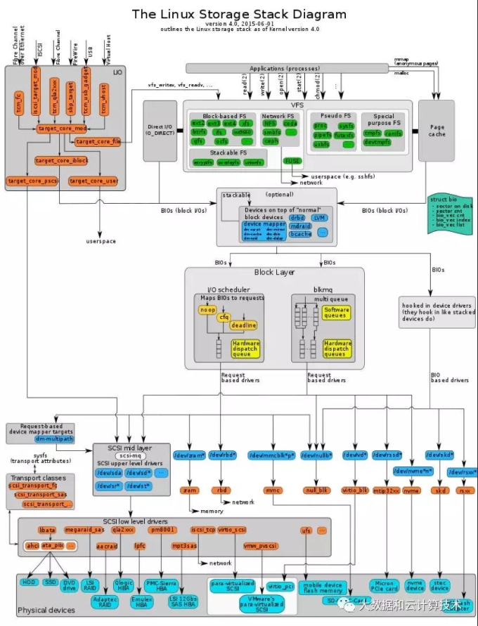 云计算本质就是单机计算能力的无限扩展,我们先看看单机的文件及IO管理。linux操作系统一个IO操作要经由文件系统vfs,调度算法,块设备层,最终落盘: