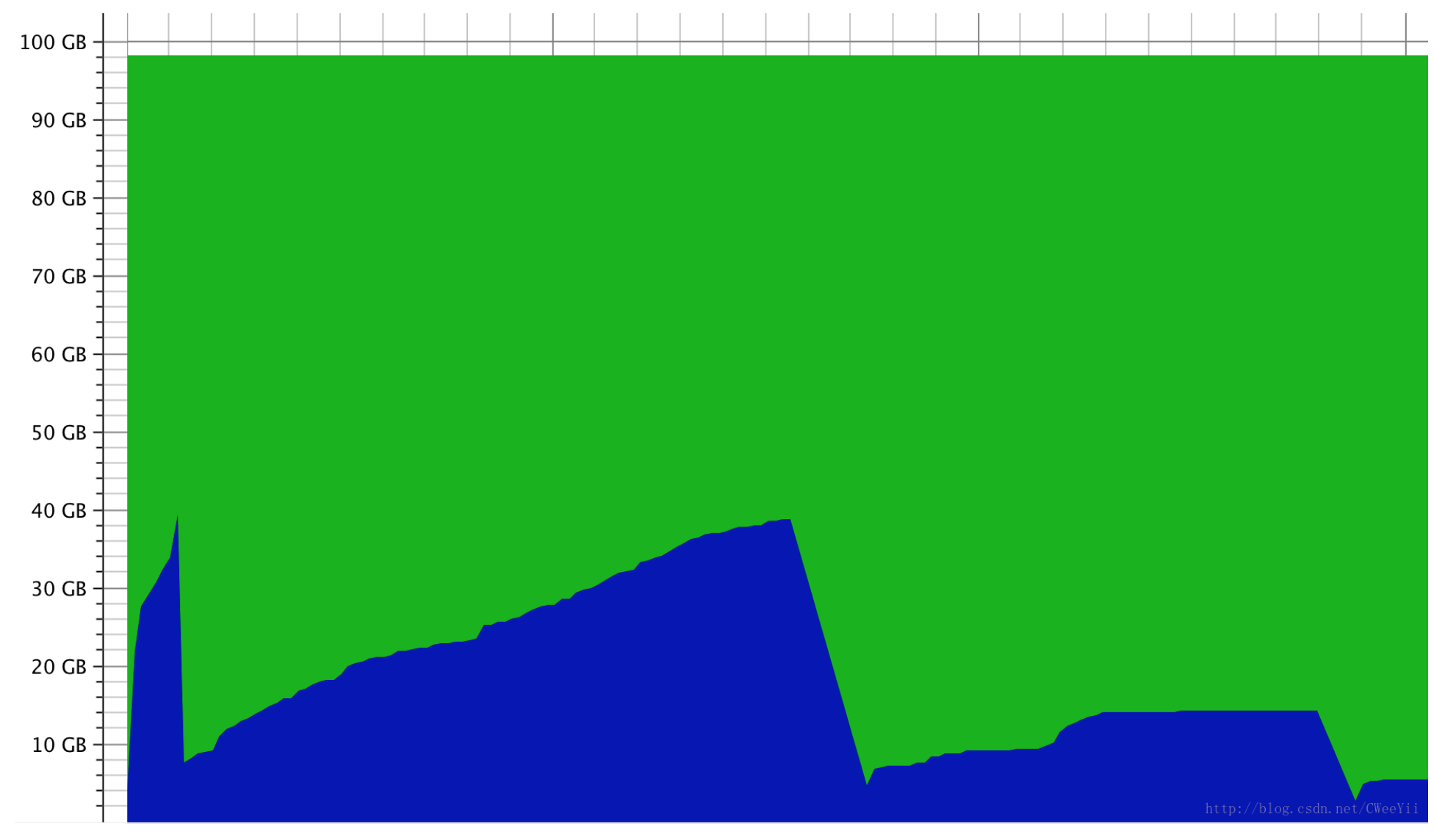 jvm启动时会分配100g虚拟内存,实际使用的内存有40g,其原理是通过swap实现的。所以过大的设置虚拟内存会引起swap操作而不是gc操作。