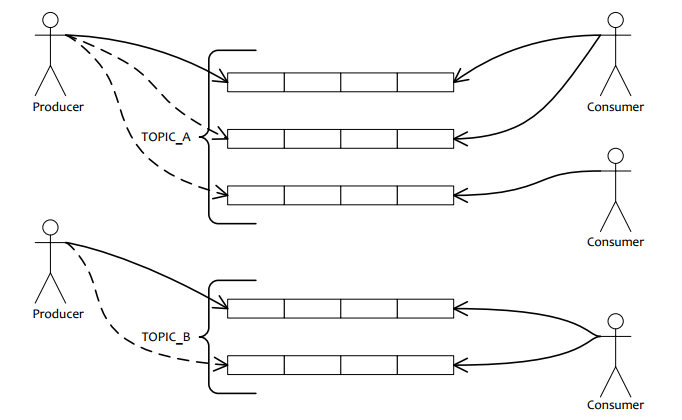 一个topic下,我们可以设置多个queue,每个queue就是我们平时所说的消息队列;因为queue是完全从属于某个特定的topic的,所以当我们要发送消息时,总是要指定该消息所属的topic是什么。然后equeue就能知道该topic下有几个queue了。但是到底发送到哪个queue呢?比如一个topic下有4个queue,那对于这个topic下的消息,发送时,到底该发送到哪个queue呢?那必定有个消息被路由的过程。目前equeue的做法是在发送一个消息时,需要用户指定这个消息对应的topic以及一个用来路由的一个object类型的参数。equeue会根据topic得到所有的queue,然后根据该object参数通过hash code然后取模queue的个数最后得到要发送的queue的编号,从而知道该发送到哪个queue。这个路由消息的过程是在发送消息的这一方做的,也就是下面要说的producer。之所以不在消息服务器上做是因为这样可以让用户自己决定该如何路由消息,具有更大的灵活性。