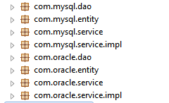 创建基本的entity service dao 不同的数据源创建不同的包 我这里为了分辨 一个用的是Mysql 一个是Oracle 方便测试,