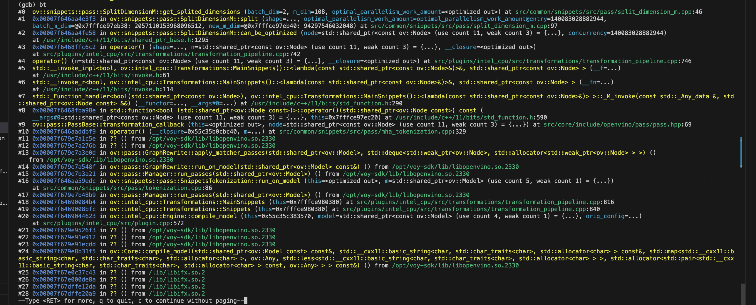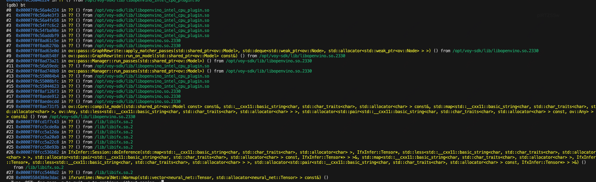 我们从ubuntu18升级到ubuntu22,发现有一个模型会卡住,在gtest、onenode planner、orion 等不同的环境都会复现,这是一个cpu模型,在做模型推理的时候卡住,用gdb attach到进程中可以看到是这个堆栈,但是这个是没有符号表的。所以看不到有啥问题。