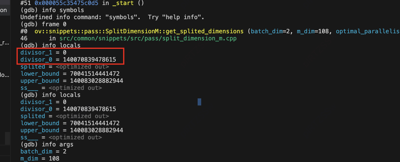 这里divisor_0 是一个很大的数,同时divisor_1 == 0,无法break,在for循环中一直递减,所以是在这里死循环了。