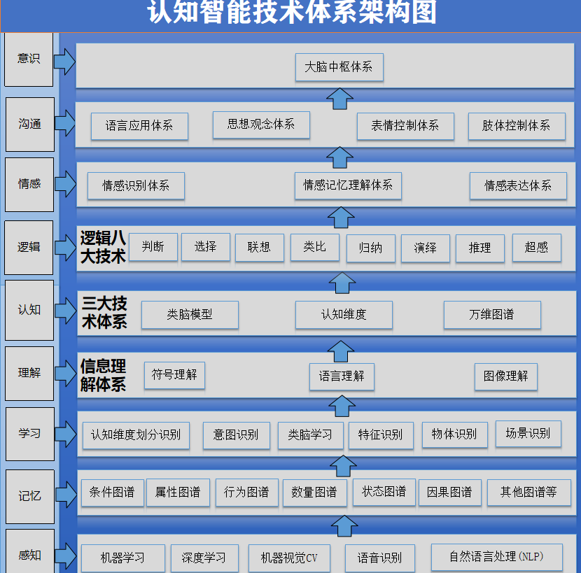 认知智能技术体系架构设计,总体上分为九个层次。 1.感知技术体系 2.记忆技术体系 3.学习技术体系 4.理解技术体系 5.认知技术体系 6.逻辑技术体系 7.情感技术体系 8.沟通技术体系 9.意识技术体系 这九大分支技术体系,分别对应了人脑的9大核心能力。在整体设计上力求做到类脑,模仿复制人脑的核心能力。从感知到记忆学习等,到最后的意识体系,是逐层往上的。上层技术体系的落地,要依赖下层技术体系的落地。下层是上层的基础支撑。而人脑的能力,基本上也是下层能力支撑更上层的能力。九大分支技术体系共同支撑起认知智能九大核心技术体系。除却目前的人工智能技术体系,认知智能新创立的核心三大技术体系,就是类脑模型,认知维度和万维图谱。这是整套认知智能技术体系的关键所在。这三大技术体系,也是国内独创的技术体系,没有复制或者模仿任何国外现有的技术体系。认知智能整套技术体系能在多大程度上做到复制类脑能力,现在还无法准确评估,整套技术体系的架构设计,是基石。为未来复制人脑能力,提供了重要的参考依据。