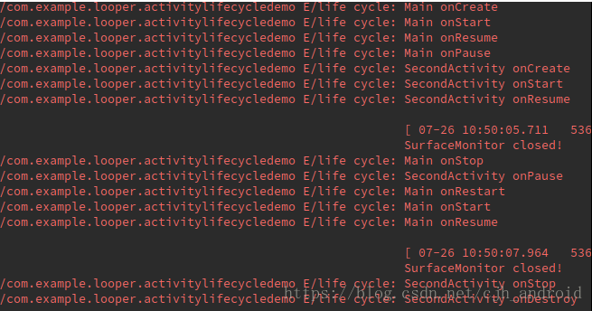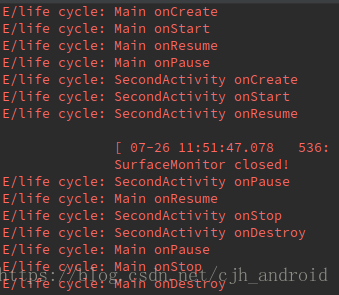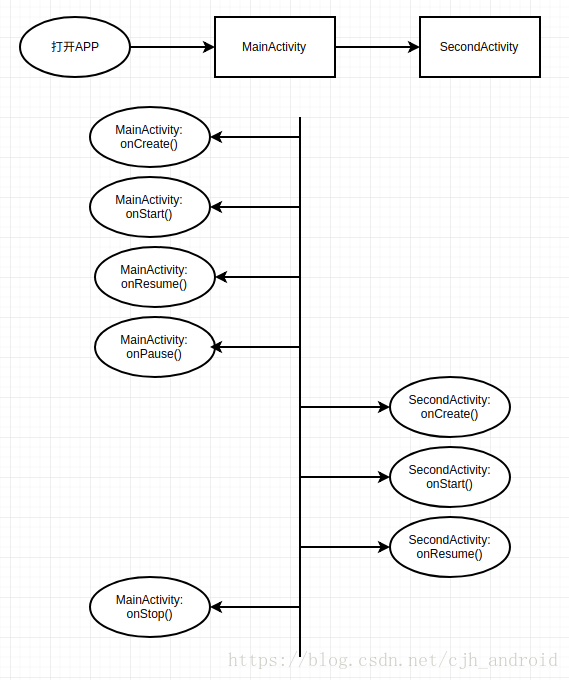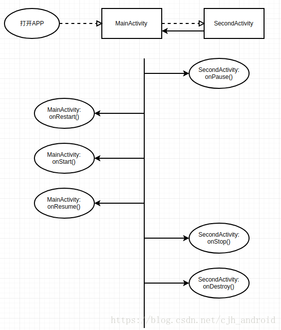 场景一:这是普通的 MainActivity 被 普通的 SecondActivity 覆盖的情形具体流程: MainActivity 跳转到 SecondActivity; SecondActivity 返回 MainActivity