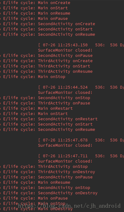 场景三:如果在场景二的基础上不返回 Main,而是由 Second 跳转到一个正常的 ThirdActivity ,再依次返回,又会有哪些生命周期被调用呢?