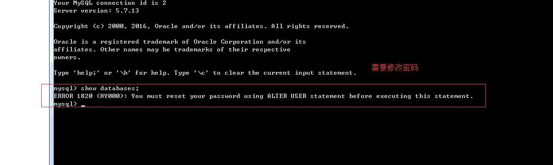 可以看到 输入 mysql -u root -p 密码 进入 第一次登陆 ,需要重置密码 要不什么也不能操作