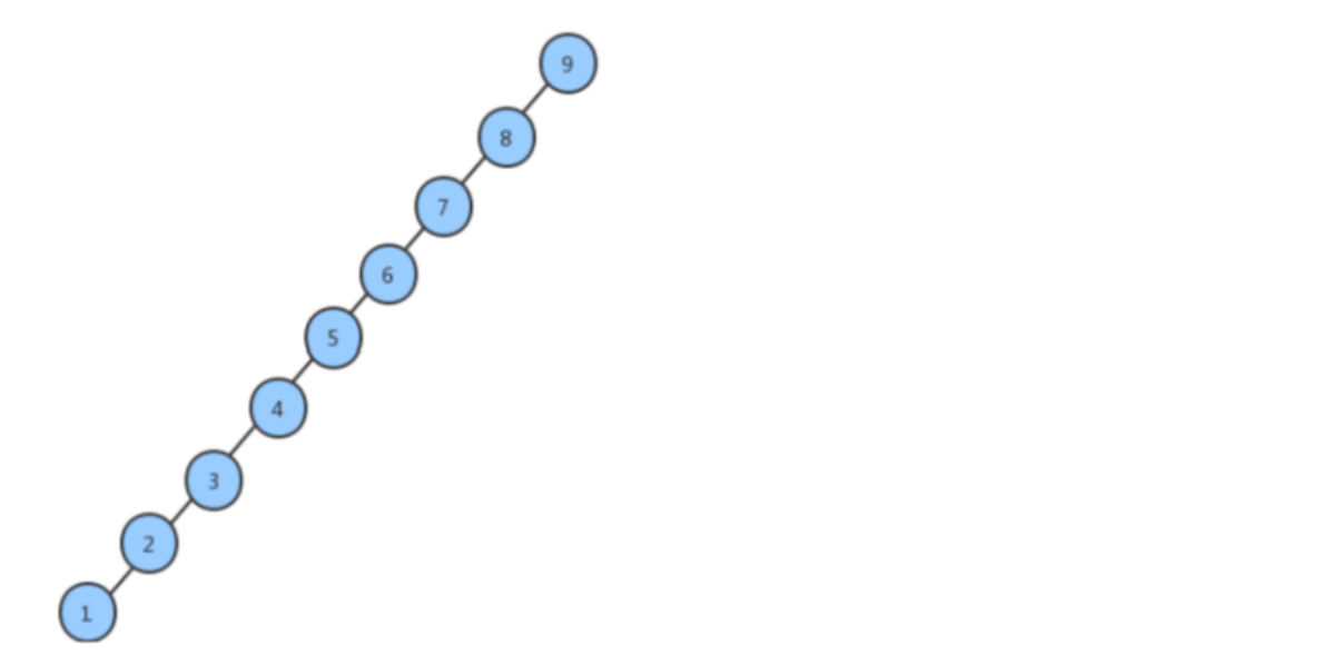 例如我们依次往二叉查找树中插入9,8,7,6,5,4,3,2,1这9个数据,那么最终构造出来的树是长得下面这个样子: